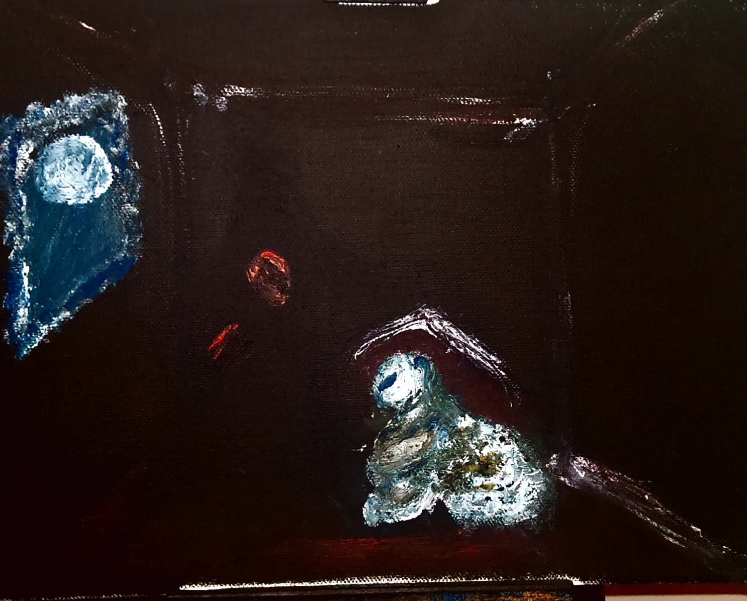 La pintura, sigo, muestra a una mujer en el sótano de su alma. Ella está agazapada o sentada, vestida de blanco manchado. Parece presa de la oscuridad aunque por una íngrima ventana, o espejo, se cuela, una lejana luna llena.
